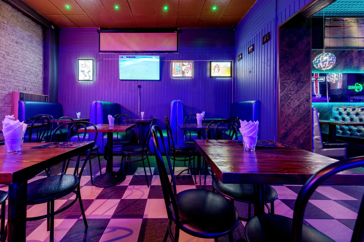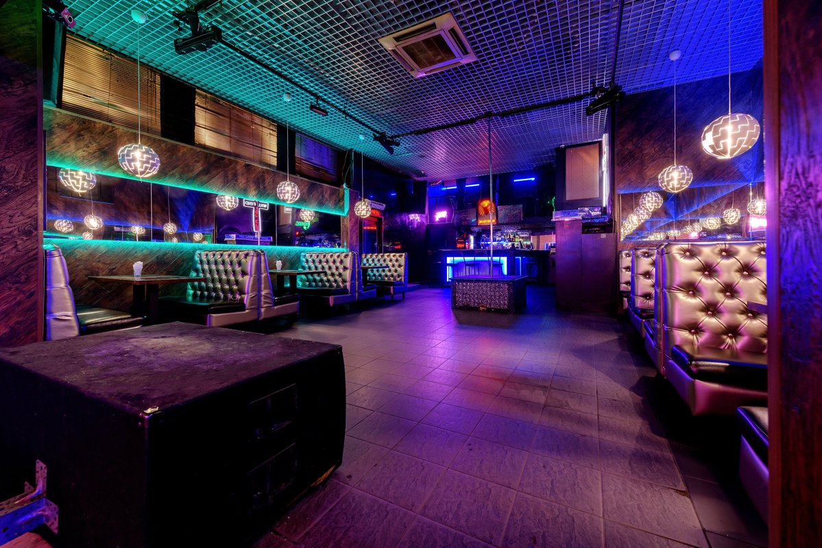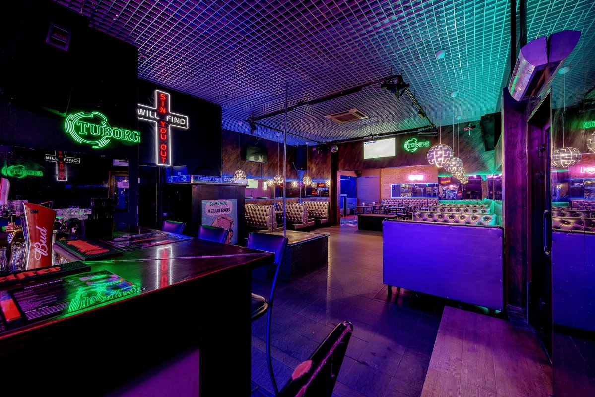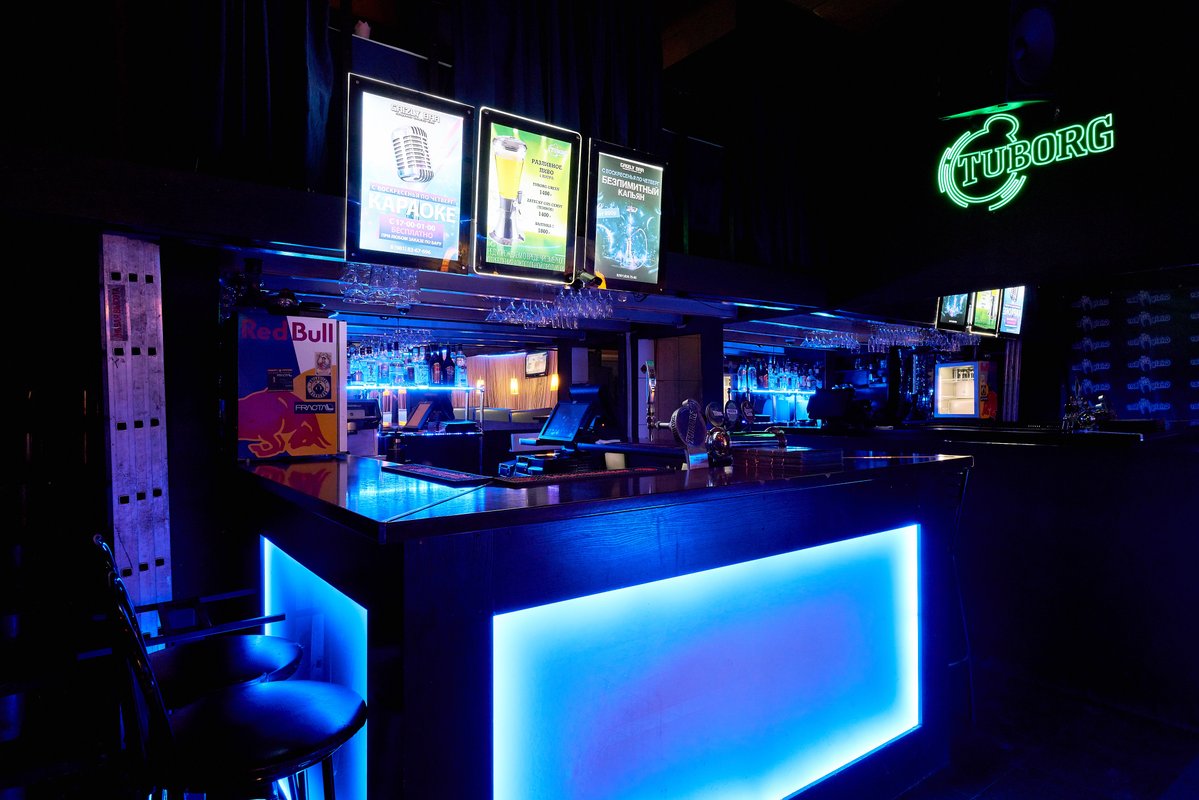 1. Неплохой дизайн помещения. Есть стена с плакатом Grizzly Bara для фото, приятные светодиодные ленты на стенах, есть диваны (4-6шт.), второй этаж (не знаю кто там сидит он оч маленький, я там не был).